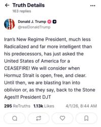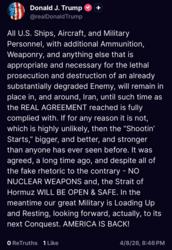 >Trump: Numerous Agreements, Lists, and Letters are being sent out by people that have absolutely nothing to do with the U.S.A. / Iran Negotiation, in many cases, they are total Fraudsters, Charlatans, and WORSE. They will be rapidly exposed after our Federal Investigation is completed. There is only one group of meaningful “POINTS” that are acceptable to the United States, and we will be discussing them behind closed doors during these Negotiations. These are the POINTS that are the basis on which we agreed to a CEASEFIRE. It is something that is reasonable, and can easily be dispensed with. It’s very much like Fake News CNN last night, headlining a “source” that had no power or authority to write a Letter claiming great authority.